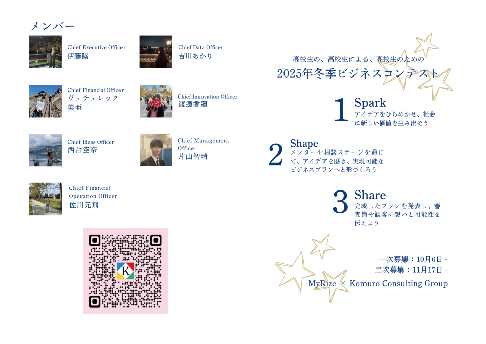 | 創設者 兼 審査員 | ≪ MiRyze 高校生ビジネスプランコンテスト プロジェクトチーム ≫ 高校1年生 伊藤 陸(Chief Executive Officer) ‡ 高校2年生 片山 智晴(Chief Management Officer) ‡ 高校2年生 渡邊 香蓮(Chief Innovation Officer) ‡ 高校2年生 西台 空奈(Chief Idea Officer) ‡ 高校2年生 吉川 あかり(Chief Data Analytics Officer) ‡ 高校2年生 佐川 元飛(Chief Financial Operation Officer) ‡ 中学3年生 ヴェチェレック 美亜(Chief Financial Officer) ‡ ‡ 2025年度夏季高校生インターンシップ修了生 |